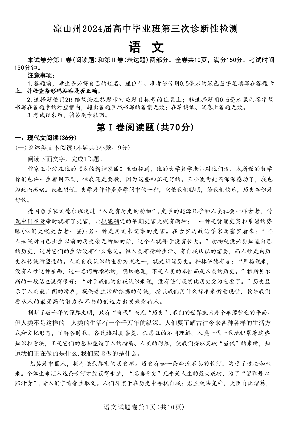 四川省凉山州2024届高中毕业班高三年级第三次诊断性检测(凉山三诊)语文