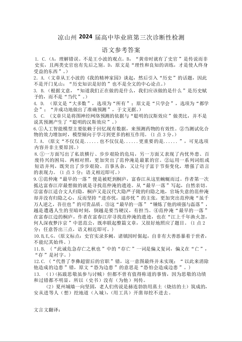 四川省凉山州2024届高中毕业班高三年级第三次诊断性检测(凉山三诊)语文答案