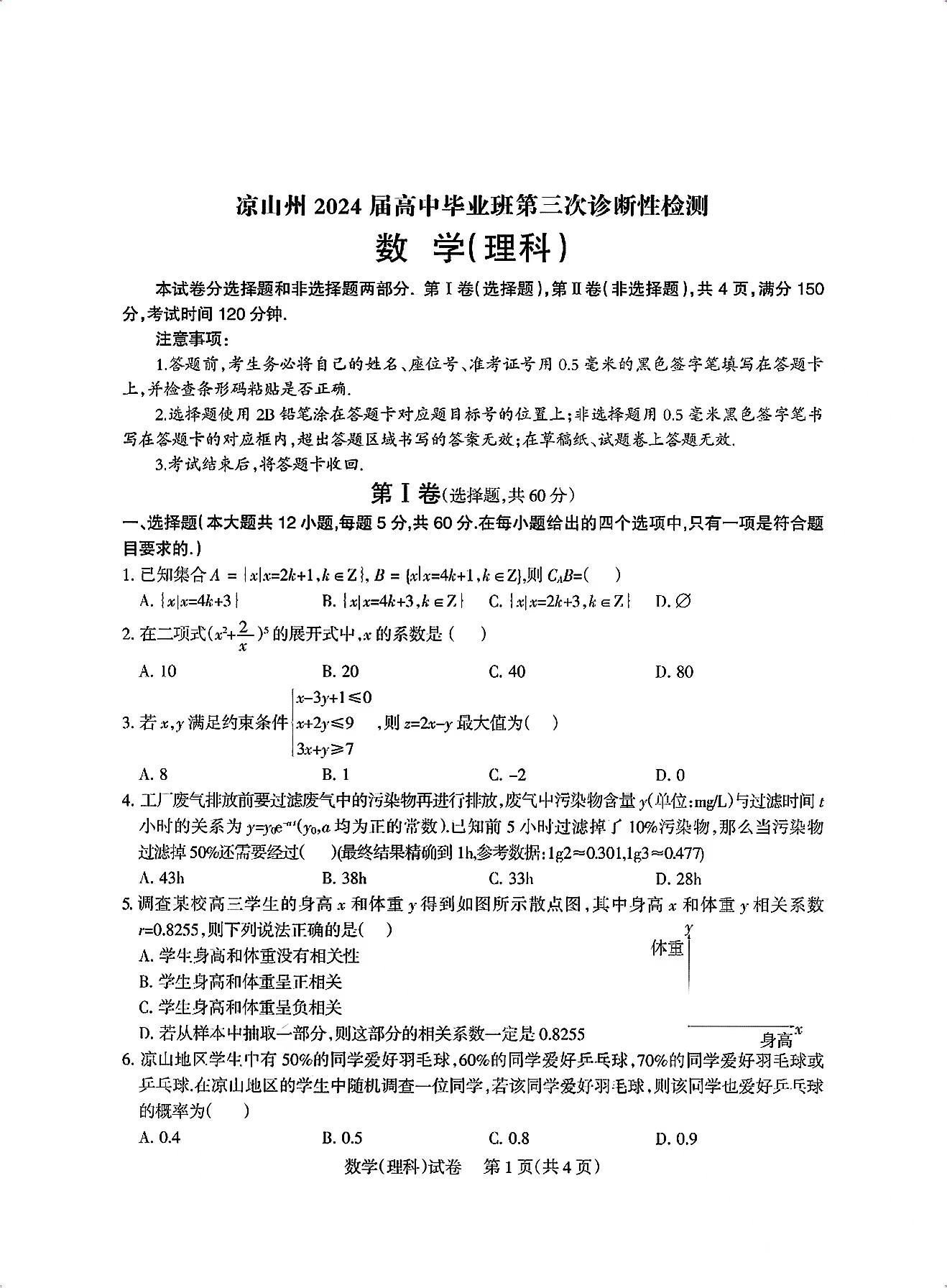 四川省凉山州2024届高中毕业班高三年级第三次诊断性检测(凉山三诊)理科数学