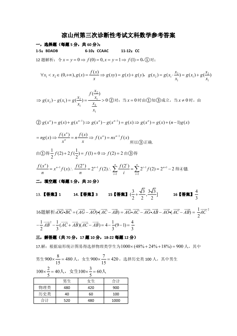 四川省凉山州2024届高中毕业班高三年级第三次诊断性检测(凉山三诊)文科数学答案