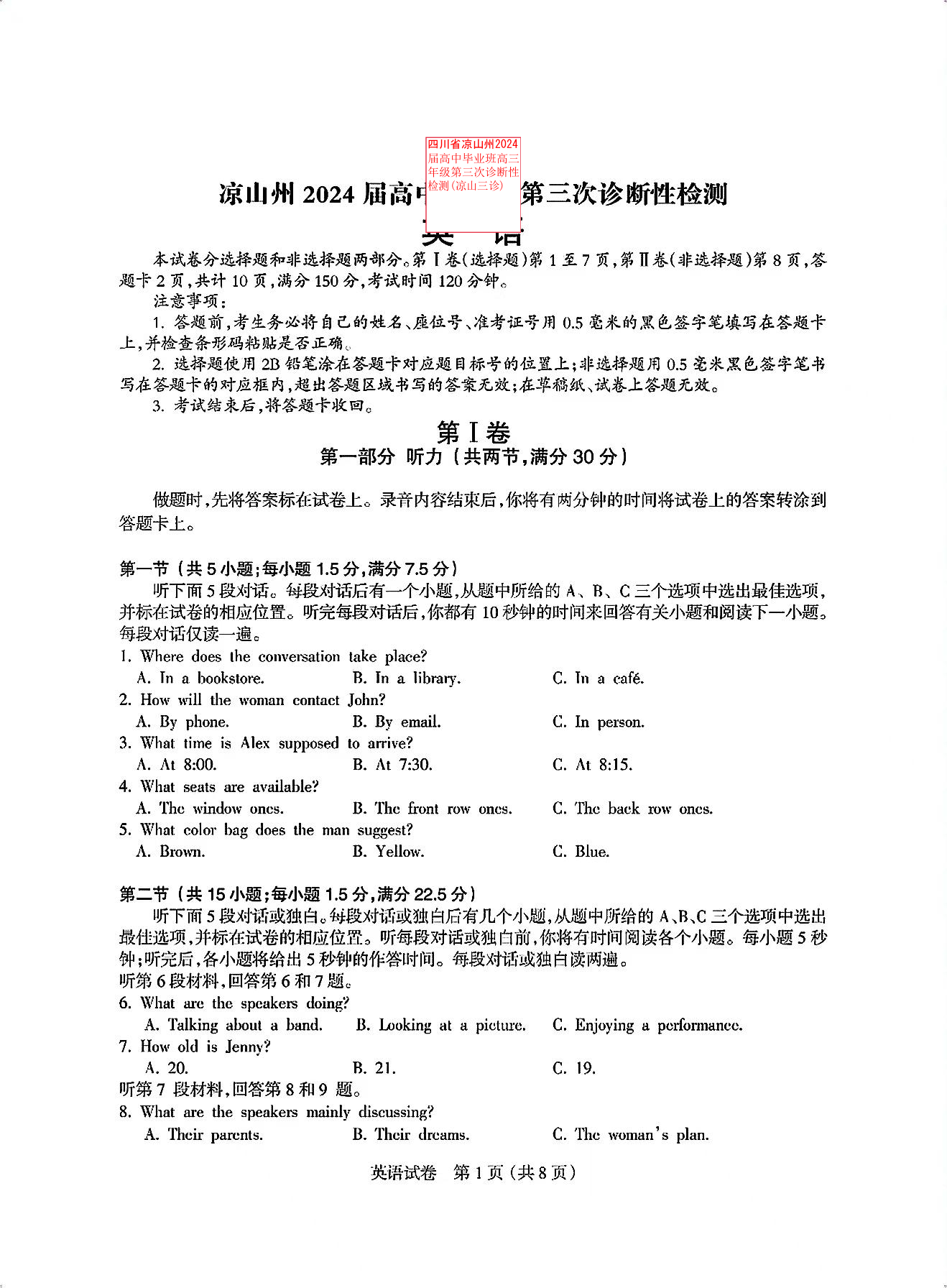 四川省凉山州2024届高中毕业班高三年级第三次诊断性检测(凉山三诊)英语