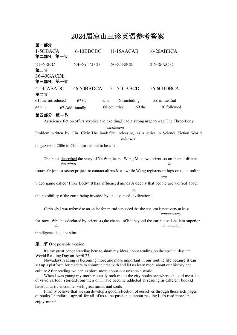 四川省凉山州2024届高中毕业班高三年级第三次诊断性检测(凉山三诊)英语答案