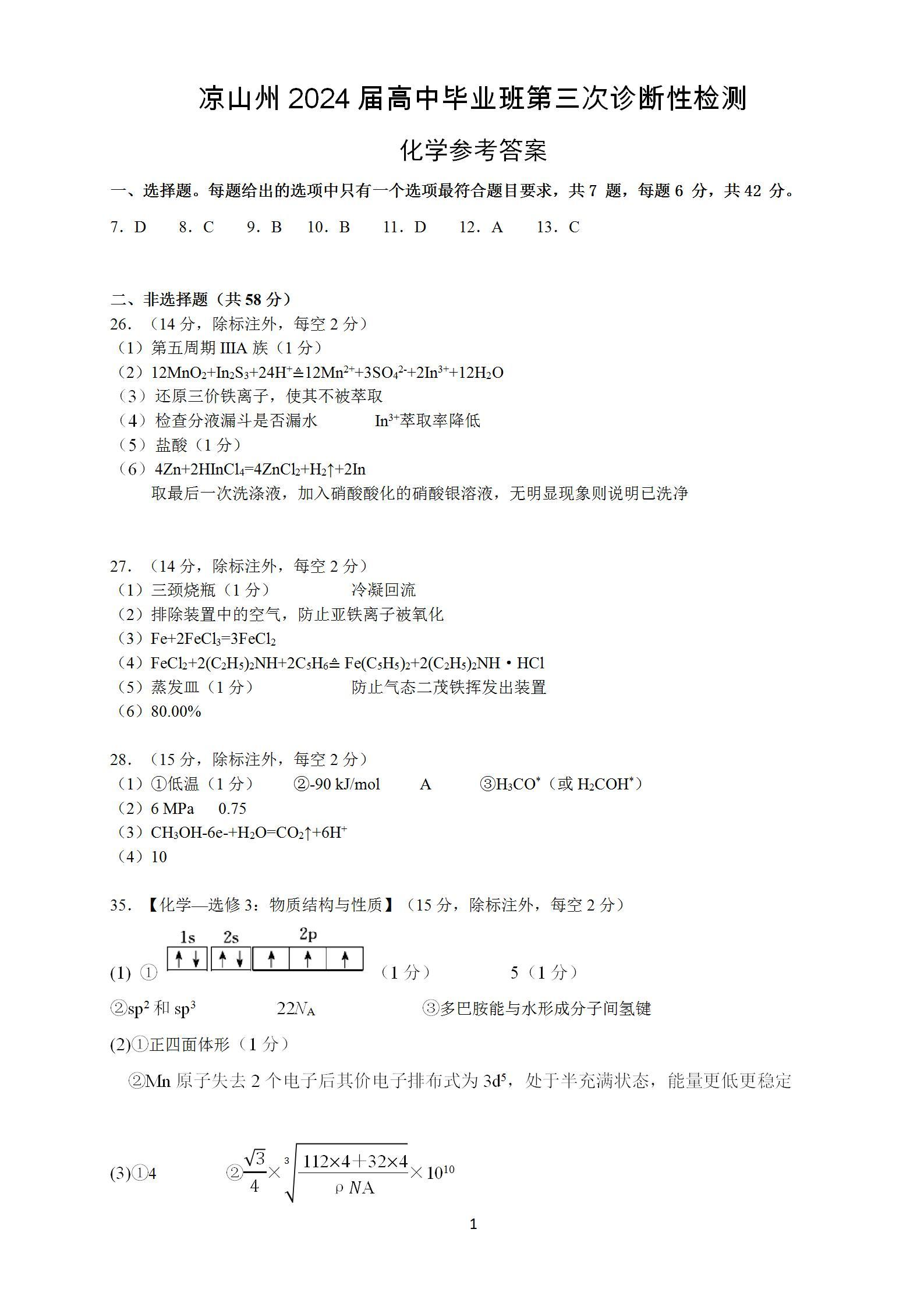 四川省凉山州2024届高中毕业班高三年级第三次诊断性检测(凉山三诊)理综答案