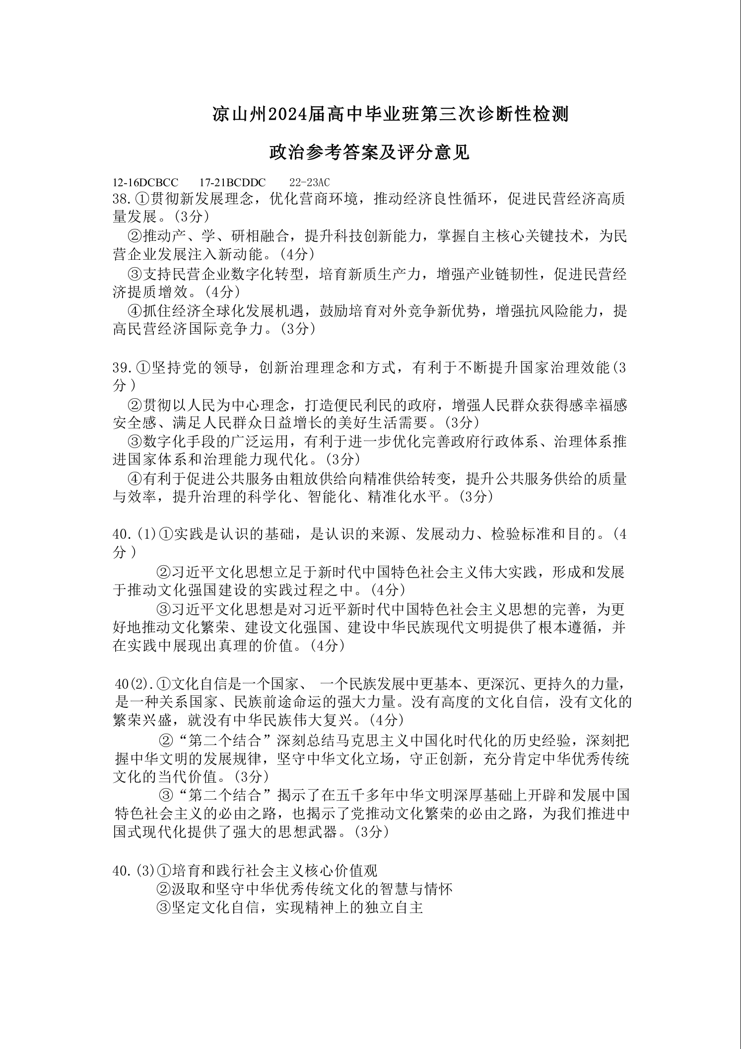 四川省凉山州2024届高中毕业班高三年级第三次诊断性检测(凉山三诊)文综答案