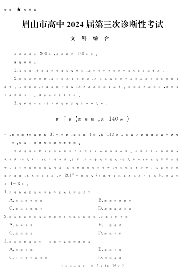 四川省眉山市2024届高三下学期第三次诊断考试文综