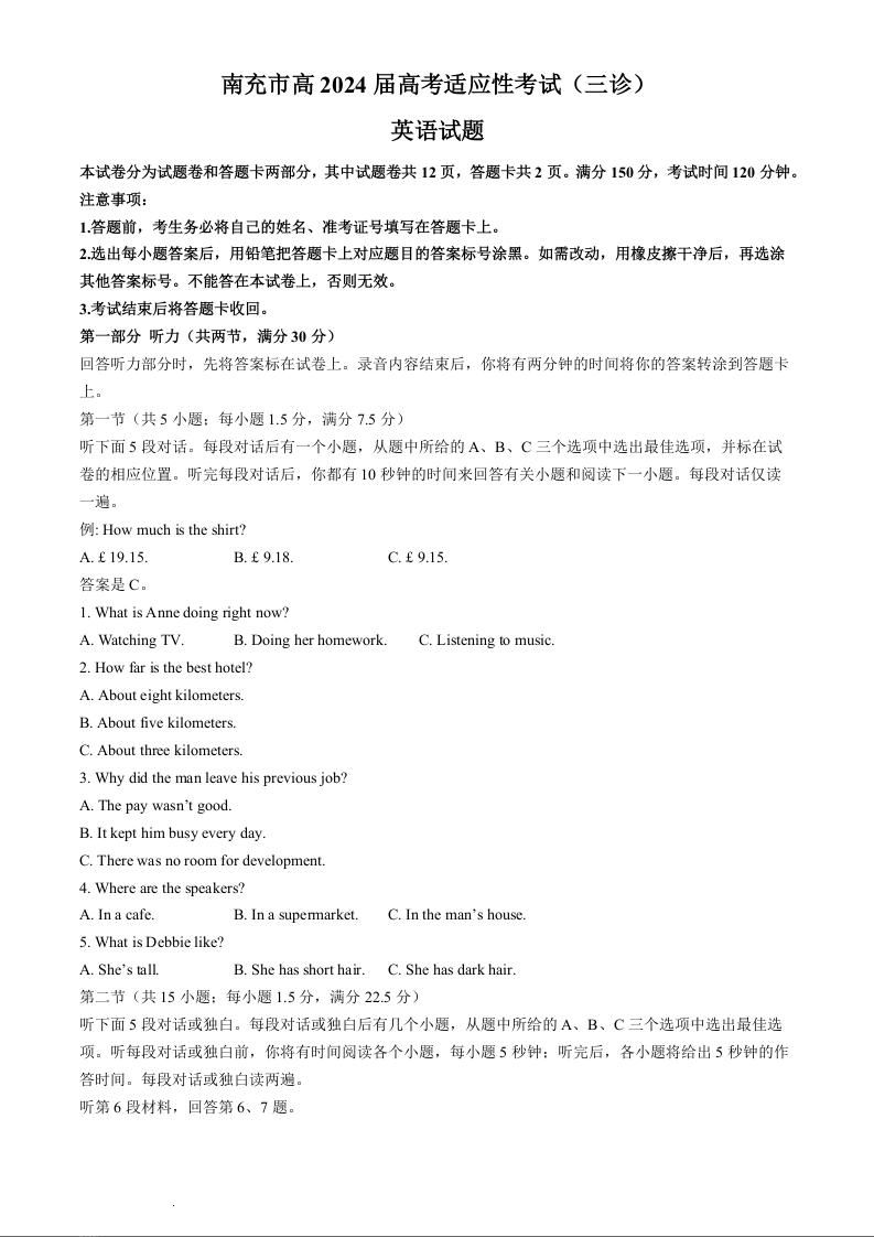 四川省南充市2024届高三下学期三诊考试(南充三诊)英语