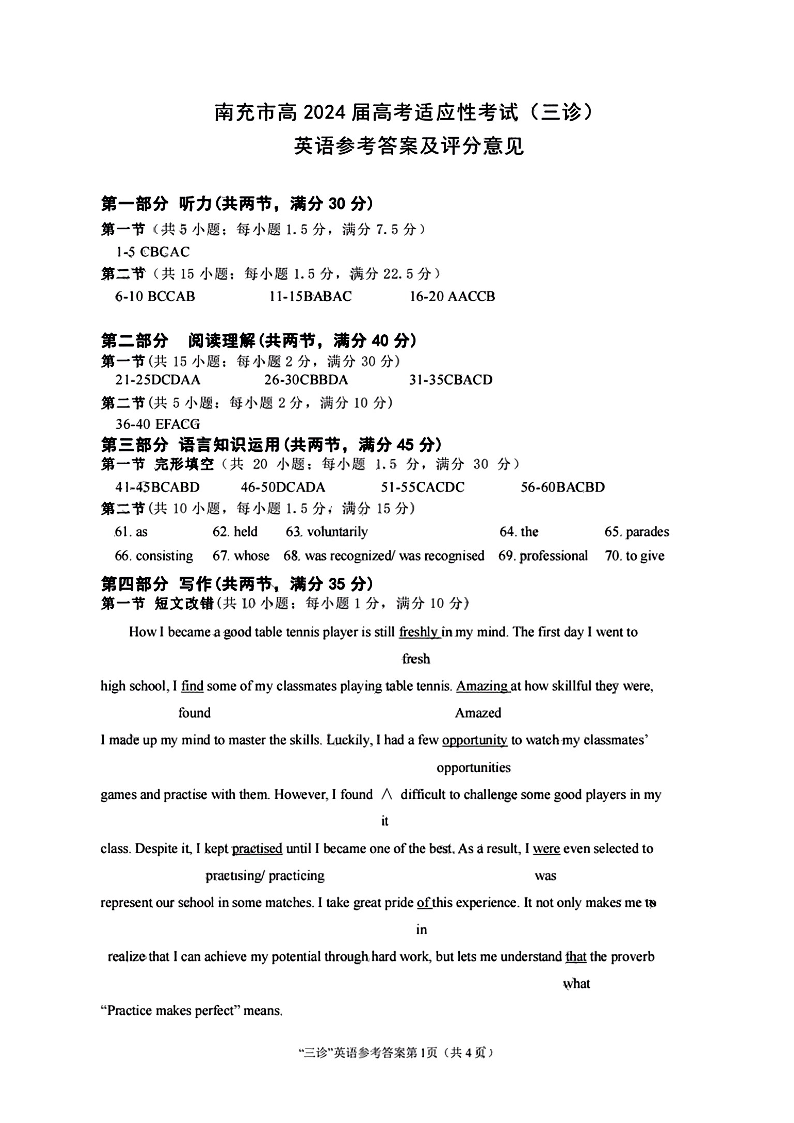 四川省南充市2024届高三下学期三诊考试(南充三诊)英语答案