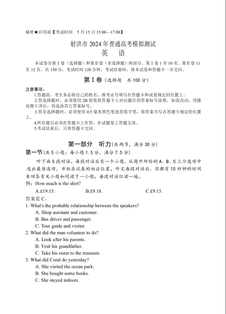 四川省射洪市2024届高三下学期5月高考模拟英语+答案