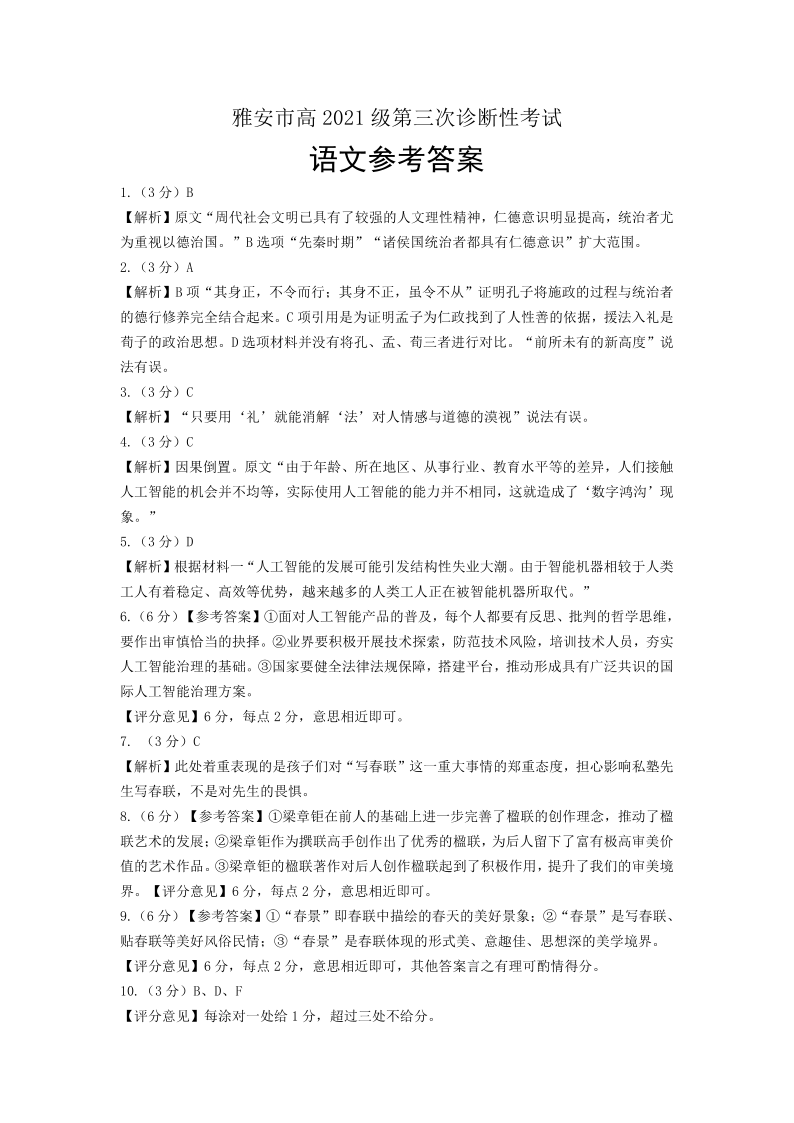 四川省雅安市2024届高三下学期第三次诊断性考试语文答案