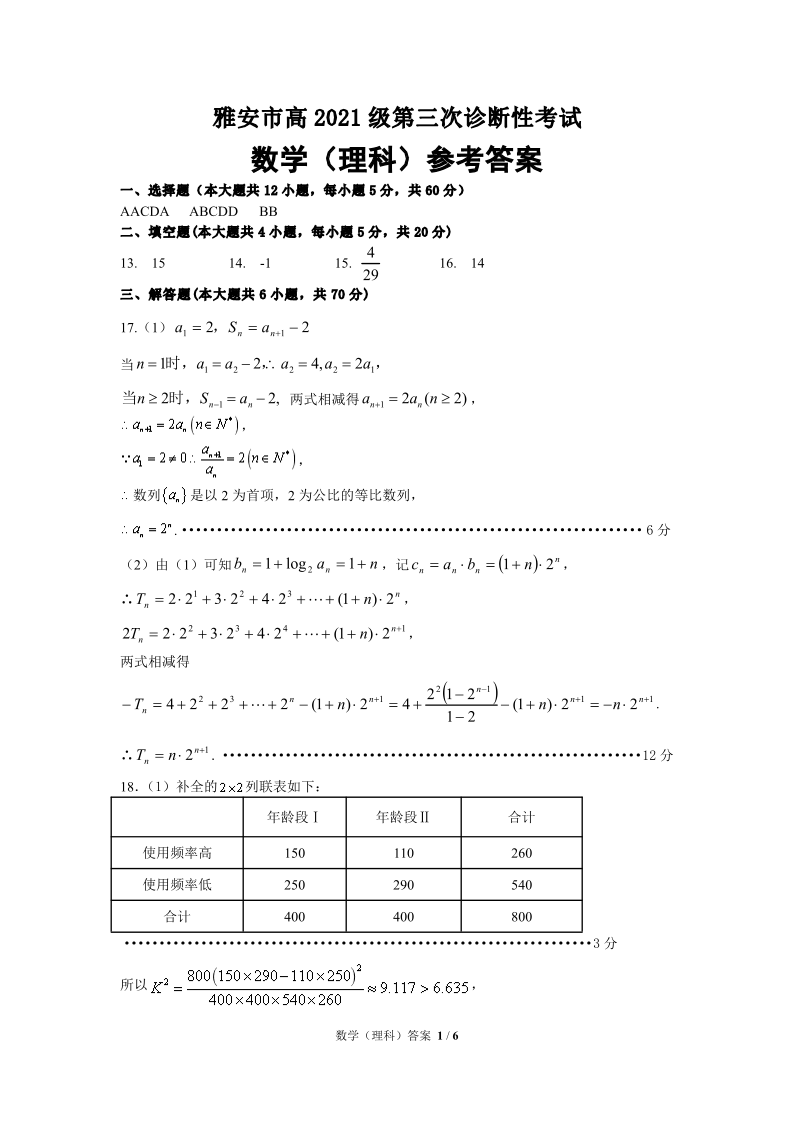 四川省雅安市2024届高三下学期第三次诊断性考试理科数学答案