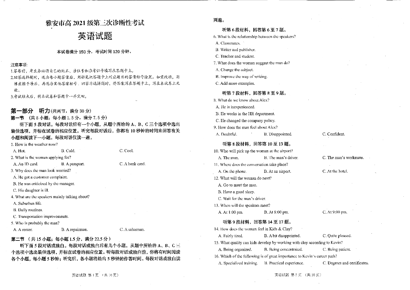 四川省雅安市2024届高三下学期第三次诊断性考试英语