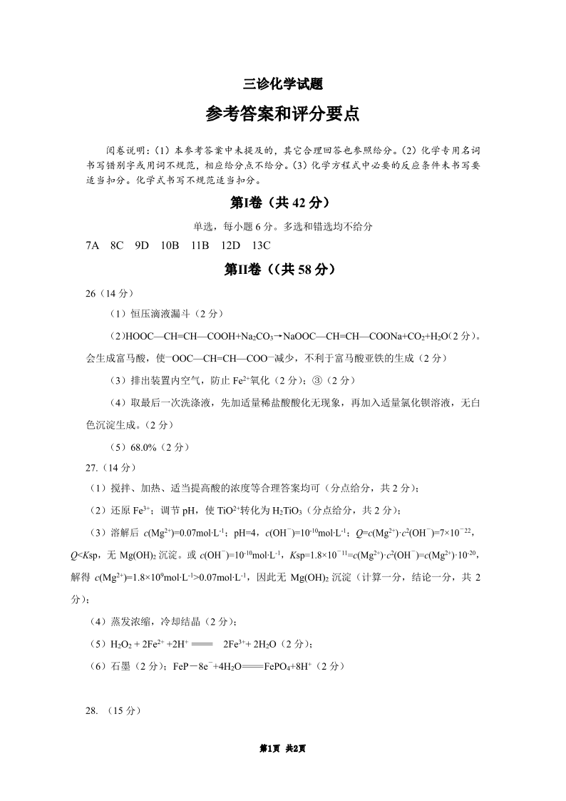 四川省雅安市2024届高三下学期第三次诊断性考试理综化学答案