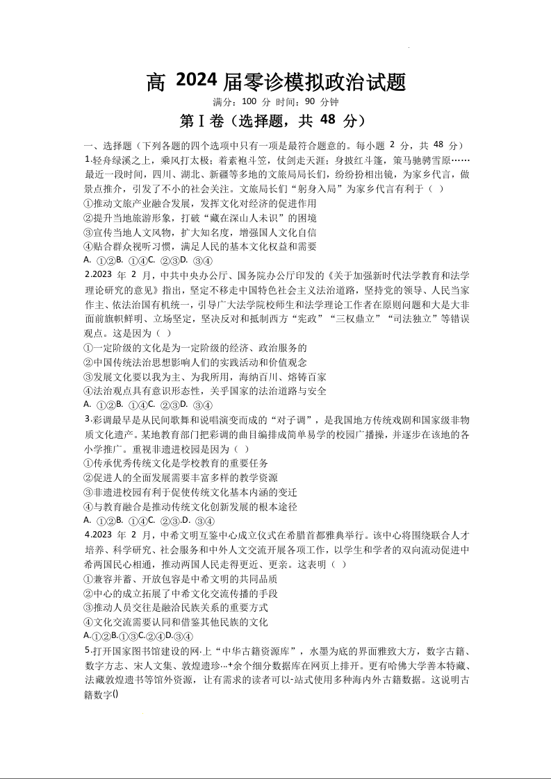 四川省成都市第七中学2024届高三零诊模拟考试政治