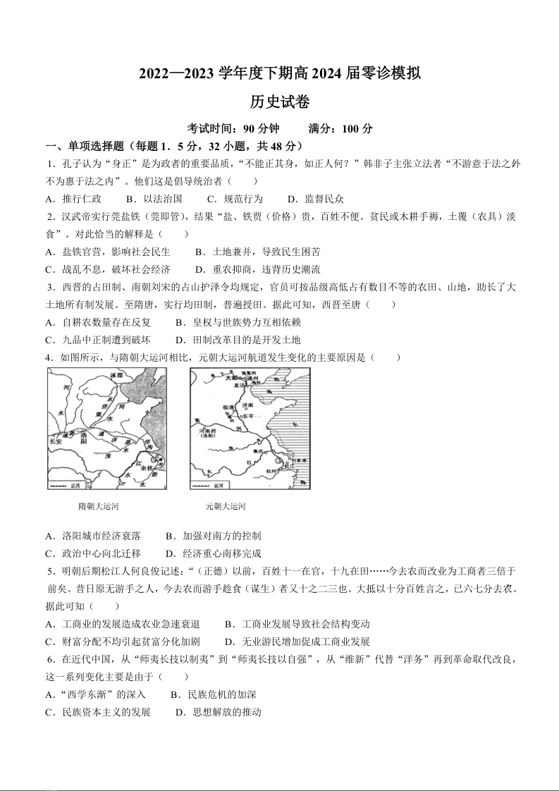 四川省成都市第七中学2024届高三零诊模拟考试历史+答案