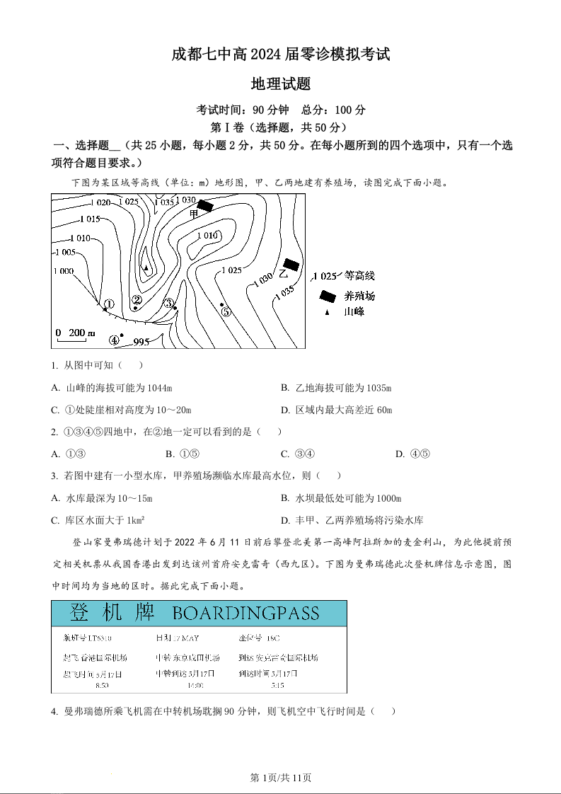 四川省成都市第七中学2024届高三零诊模拟考试地理(原卷版)