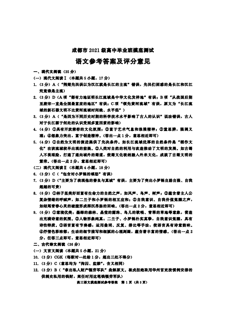 四川省成都市2024届下学期期末零诊测试语文答案