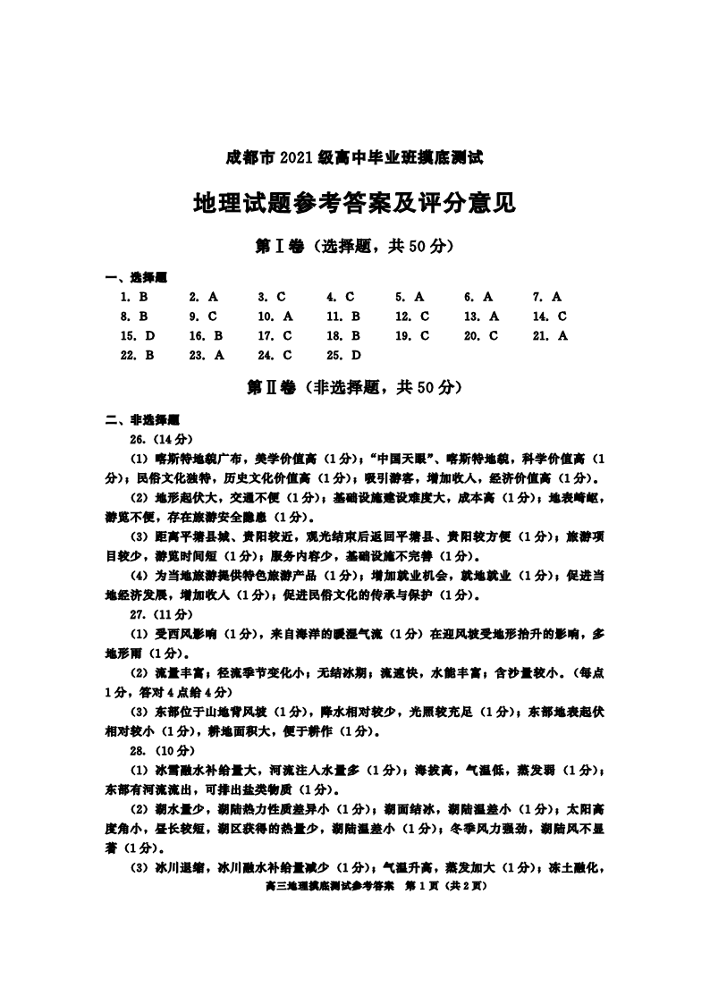 四川省成都市2024届下学期期末零诊测试地理答案