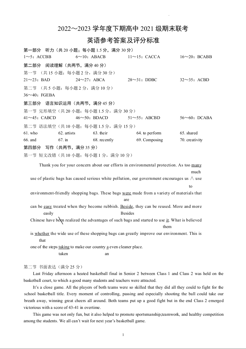 四川省成都市蓉城联盟2024届下学期期末联考英语答案