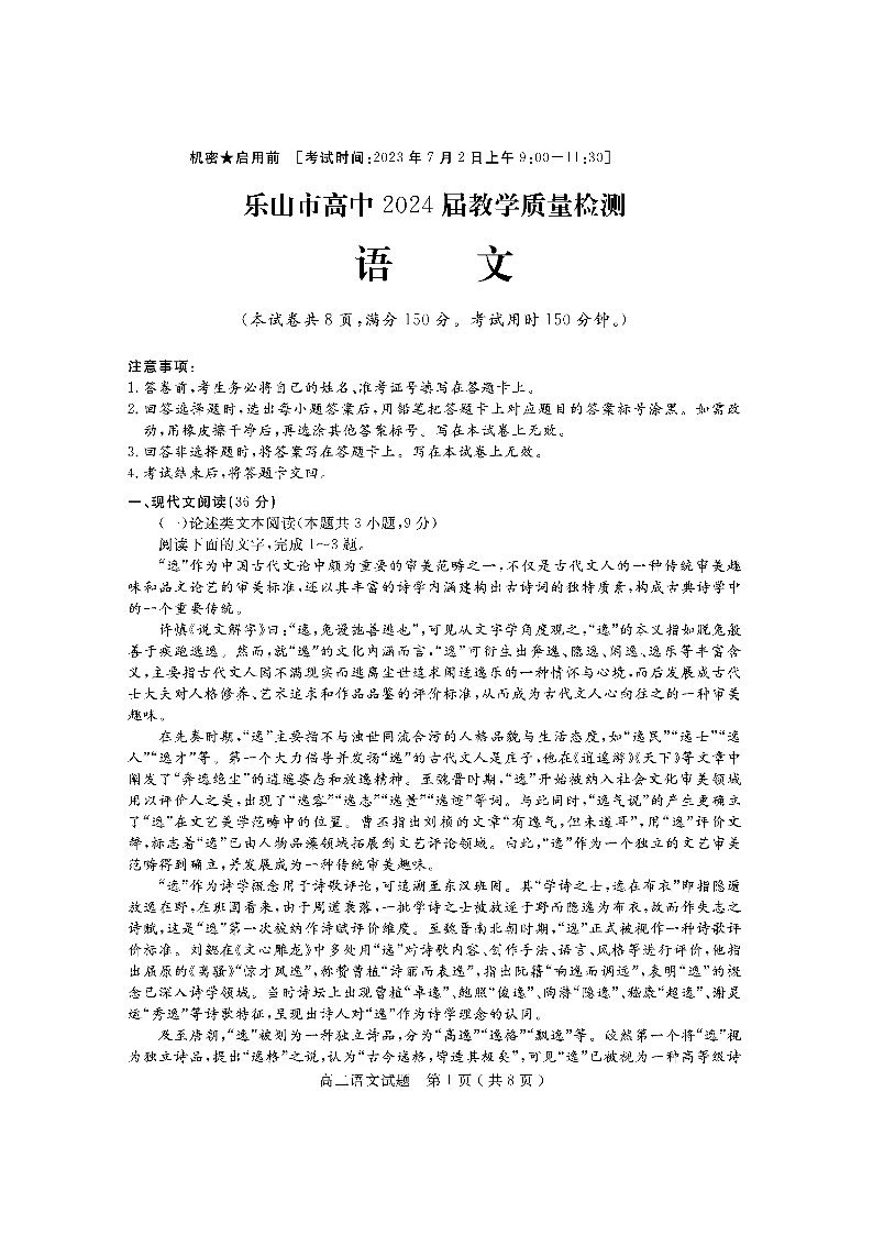 四川省乐山市2024届下学期期末教学质量检测语文+答案