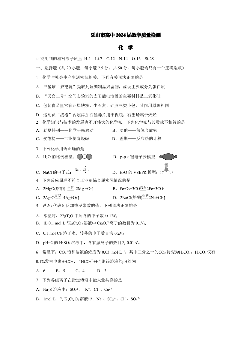 四川省乐山市2024届下学期期末教学质量检测化学+答案