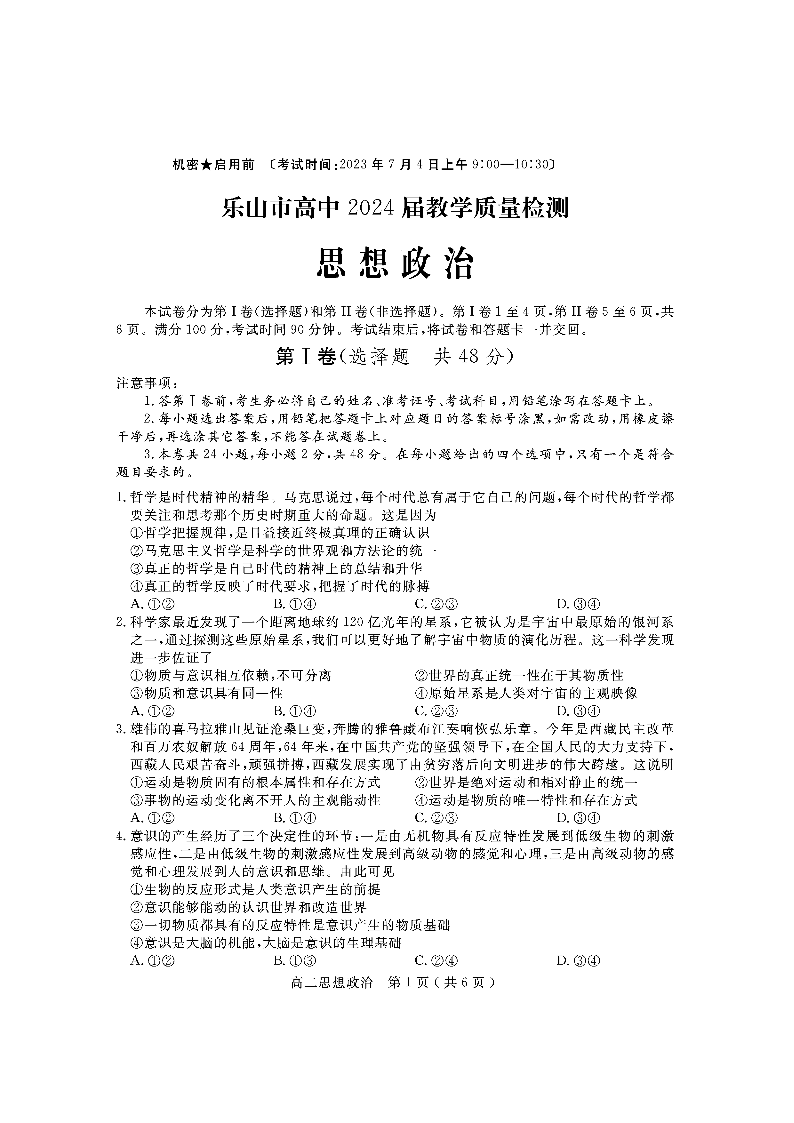 四川省乐山市2024届下学期期末教学质量检测政治+答案
