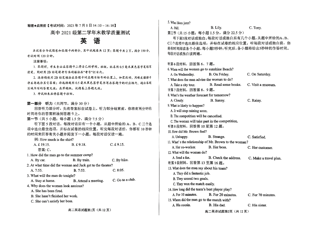四川省绵阳市高中2024届下学期期末教学质量测试英语