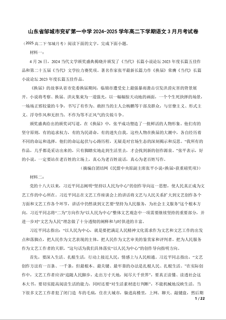山东省邹城市兖矿第一中学2024-2025学年下学期3月高二月考语文(原卷版)