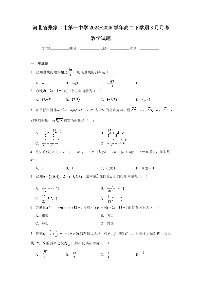 河北省张家口市一中2024-2025学年下学期3月高二月考数学+答案
