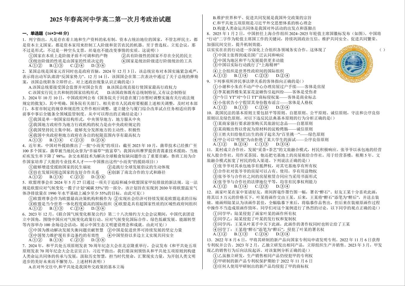 安徽省安庆市怀宁县高河中学2024-2025学年下学期4月高二月考政治+答案