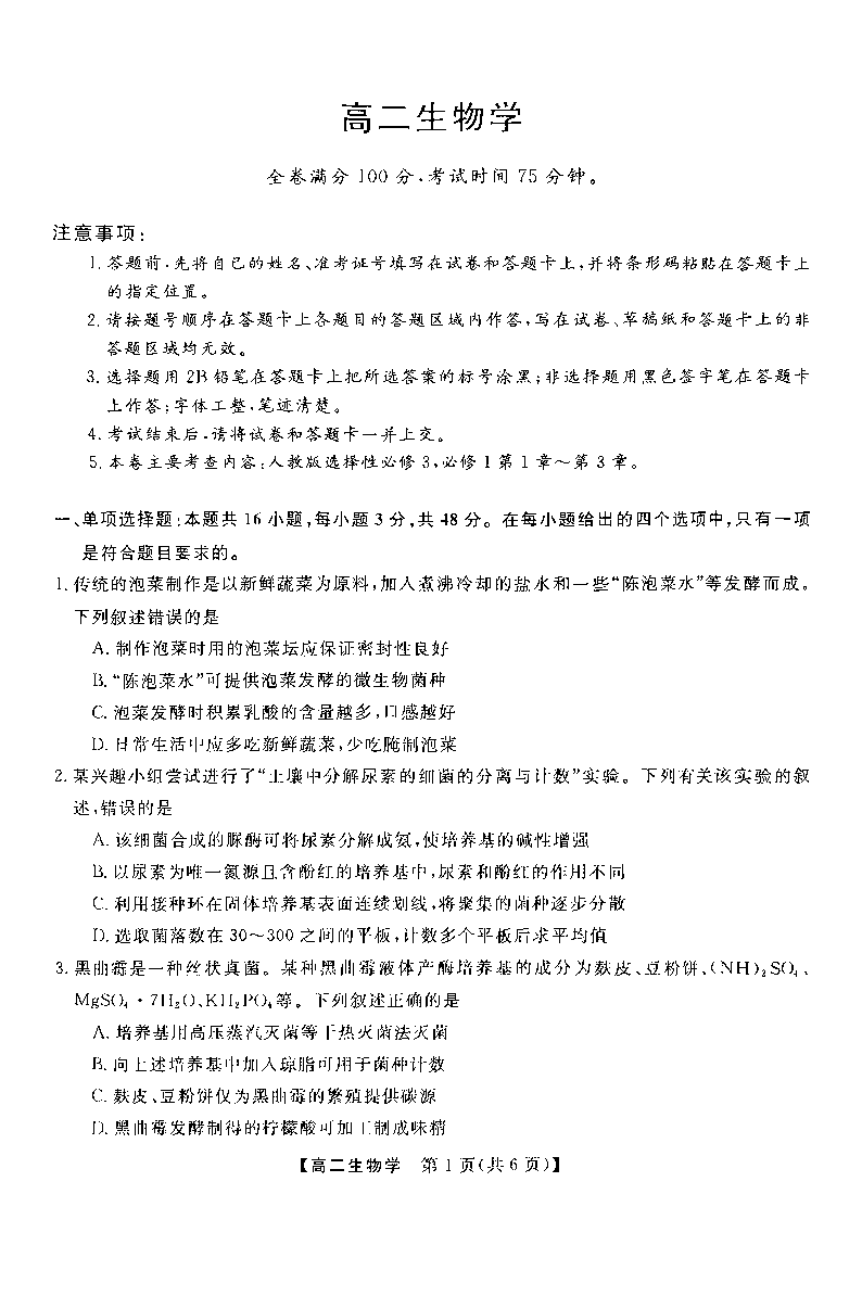 河南省部分学校2024-2025学年下学期4月高二质量检测生物+答案