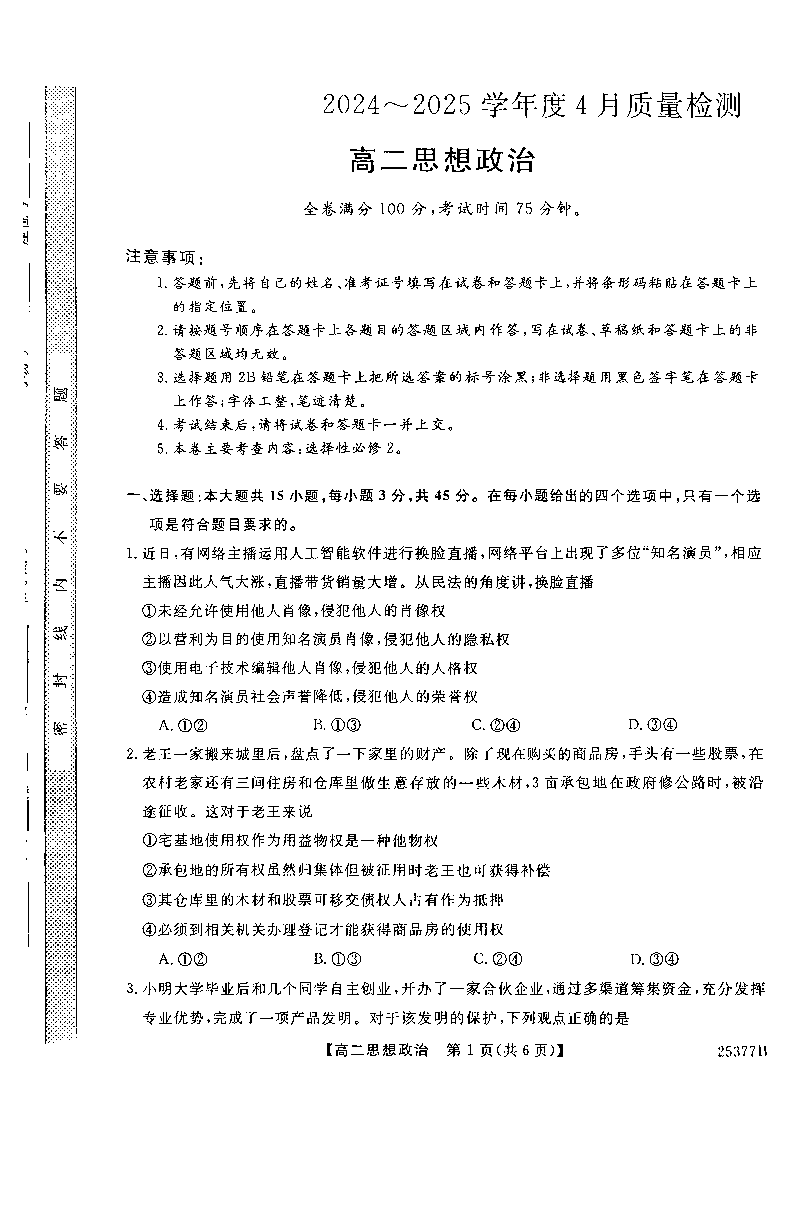 河南省部分学校2024-2025学年下学期4月高二质量检测政治+答案