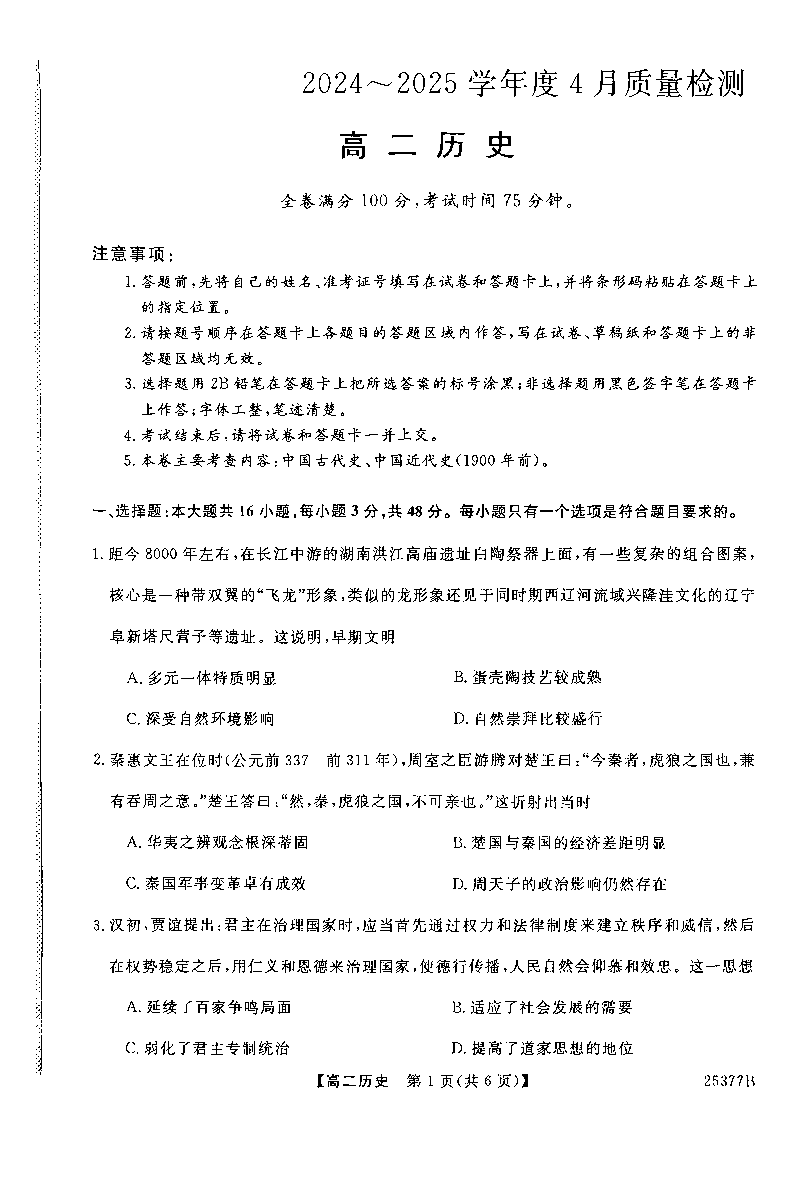 河南省部分学校2024-2025学年下学期4月高二质量检测历史+答案