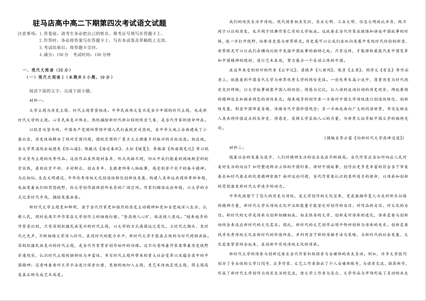 河南省驻马店市高级中学2024-2025学年下学期4月高二月考语文+答案