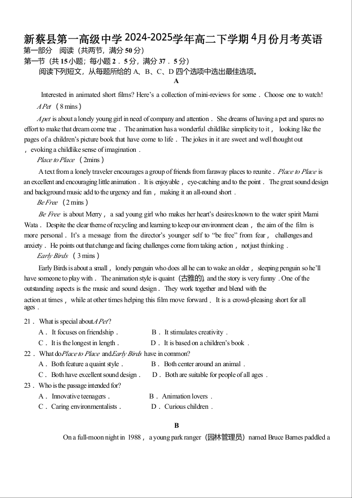 河南省驻马店市高级中学2024-2025学年下学期4月高二月考英语+答案