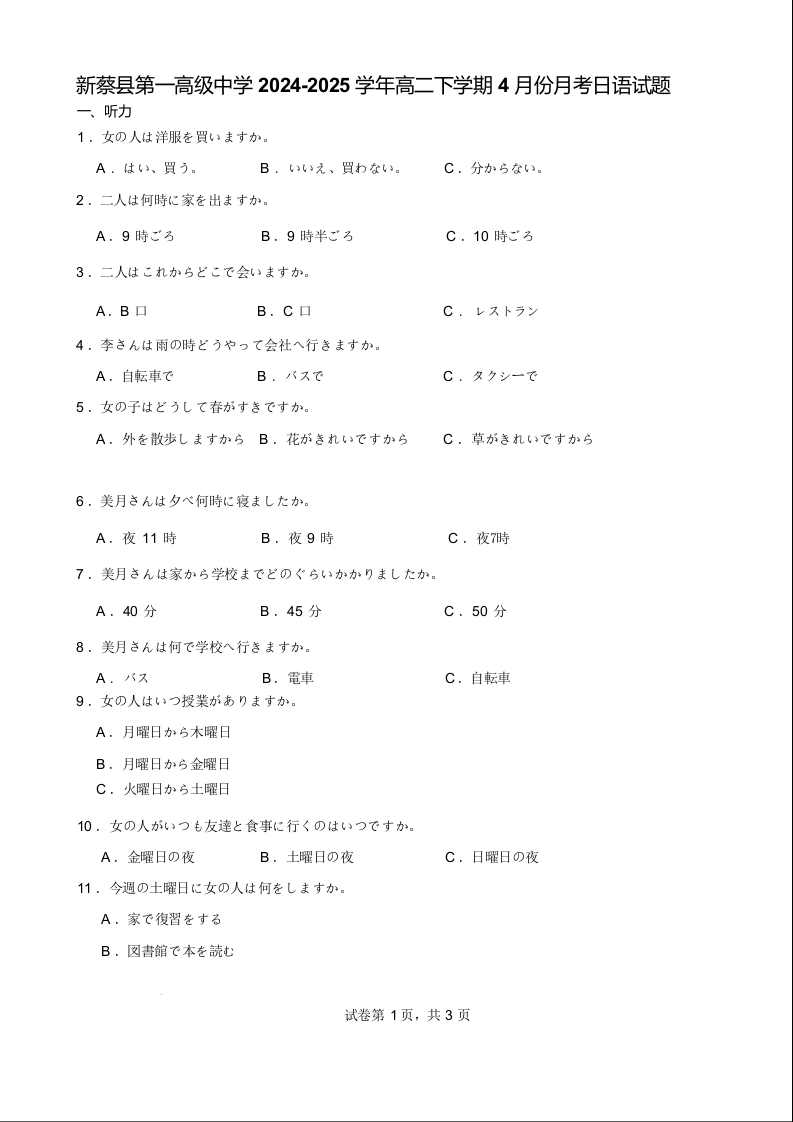 河南省驻马店市高级中学2024-2025学年下学期4月高二月考日语+答案