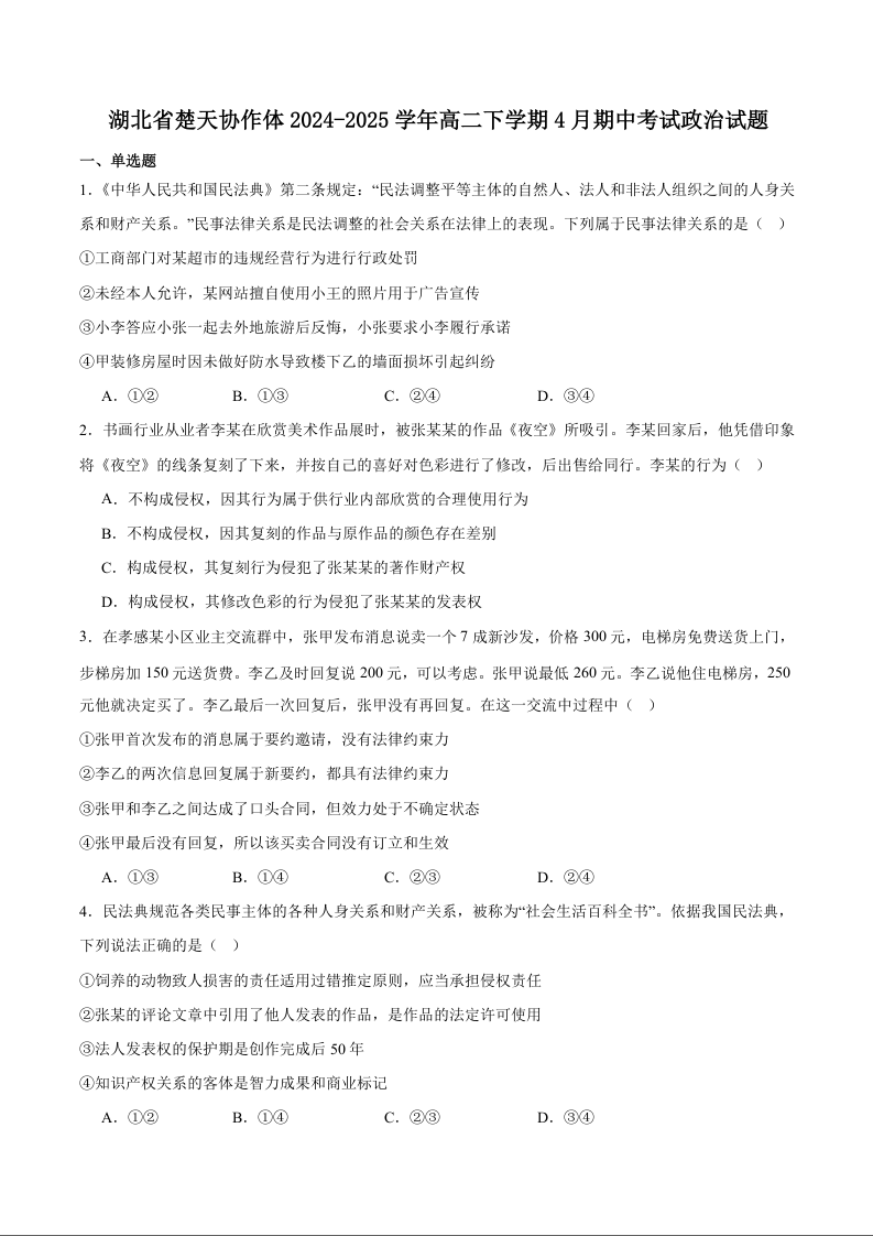 湖北省楚天协作体2024-2025学年下学期4月高二期中联考政治+答案