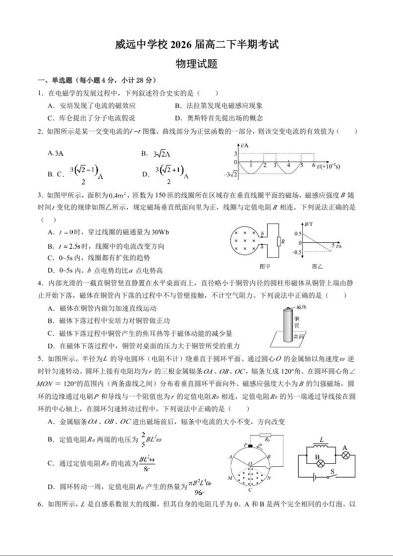 四川省内江市威远中学2024-2025学年下学期高二期中考试物理+答案