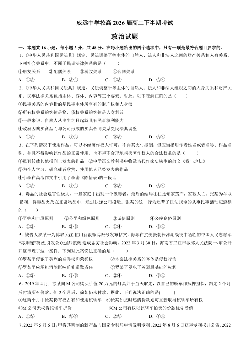 四川省内江市威远中学2024-2025学年下学期高二期中考试政治+答案