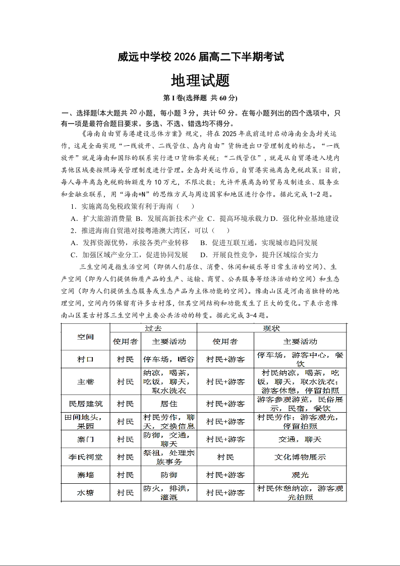 四川省内江市威远中学2024-2025学年下学期高二期中考试地理+答案