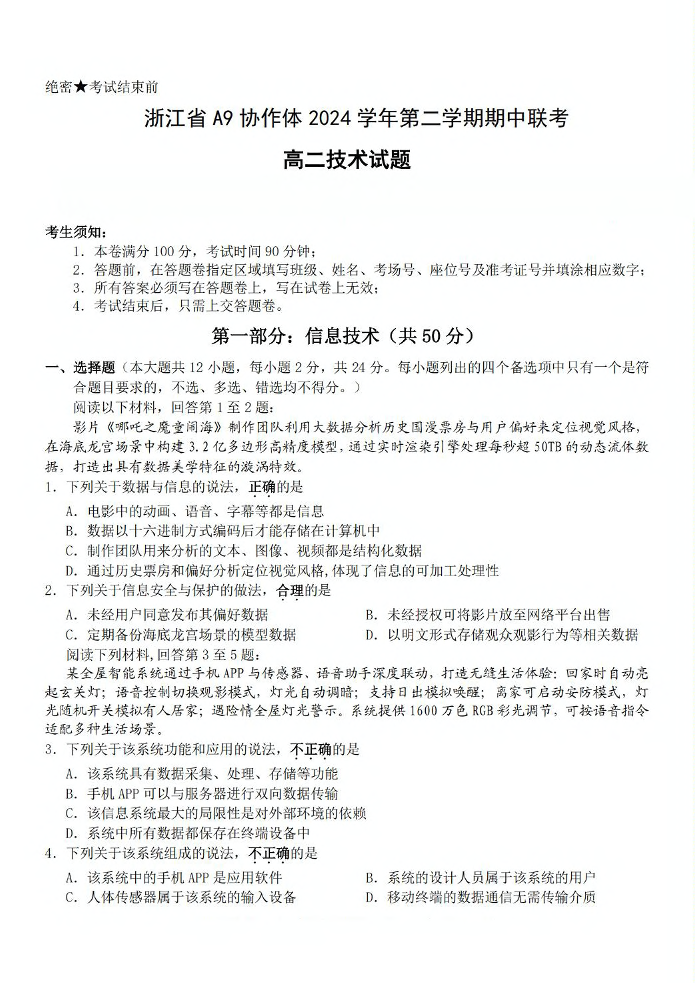 浙江省A9协作体2024-2025学年下学期4月高二期中联考信息技术+答案
