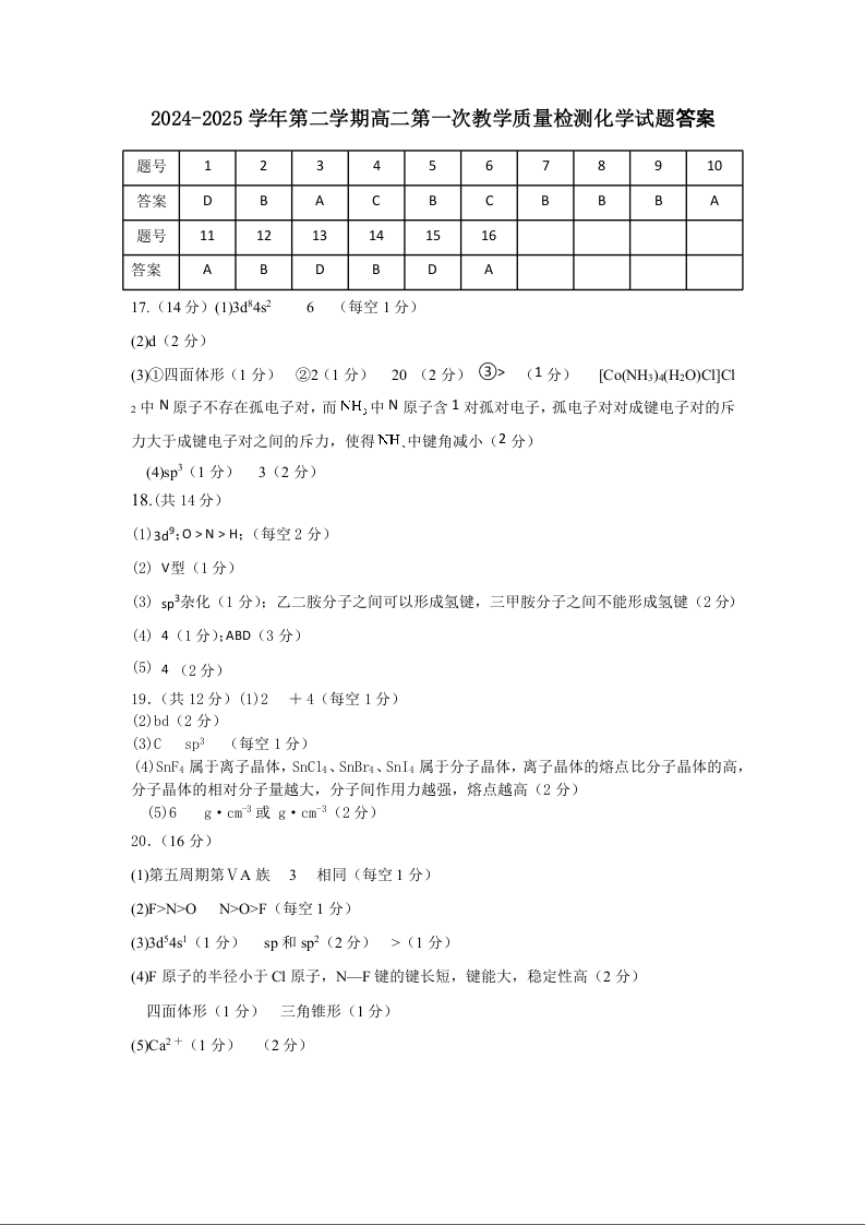 广东省三市三校2024-2025学年下学期高二第一次教学质量检测化学答案