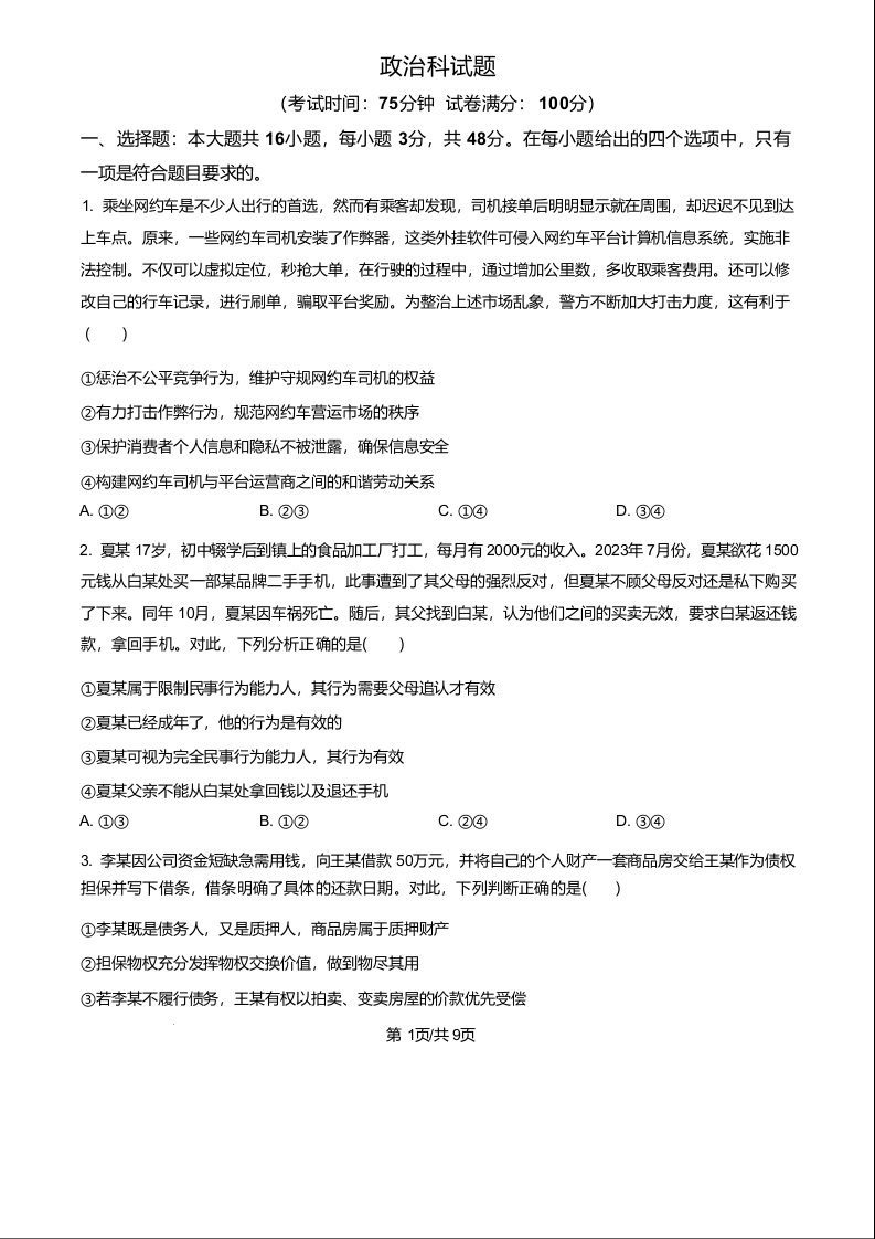 广东省三市三校2024-2025学年下学期高二第一次教学质量检测政治+答案