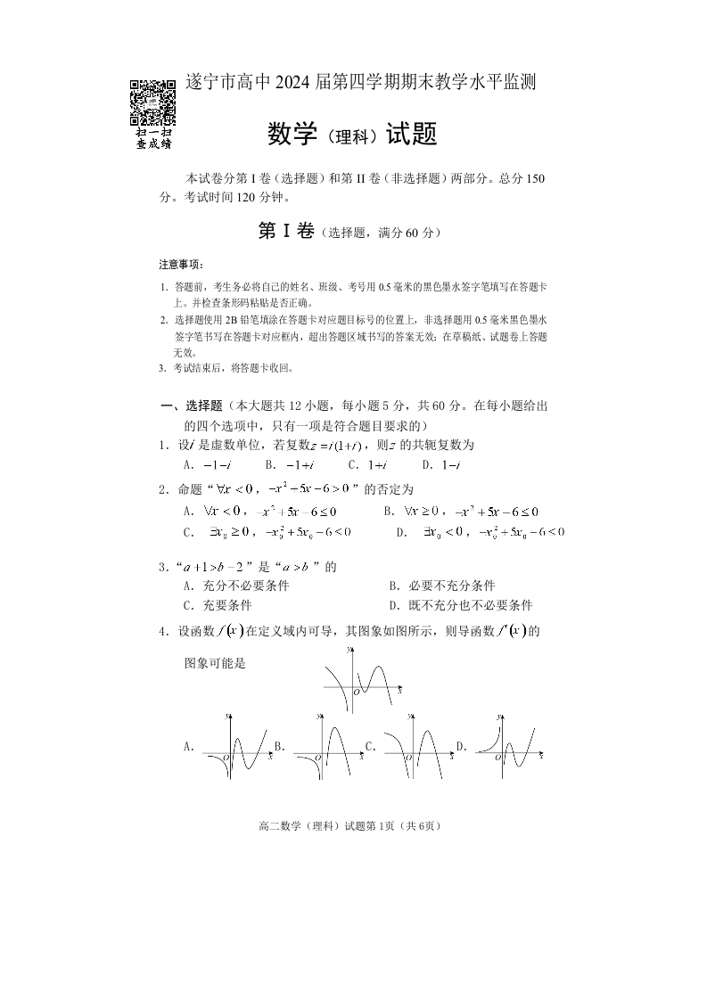 四川省遂宁市2024届下学期期末监测理科数学