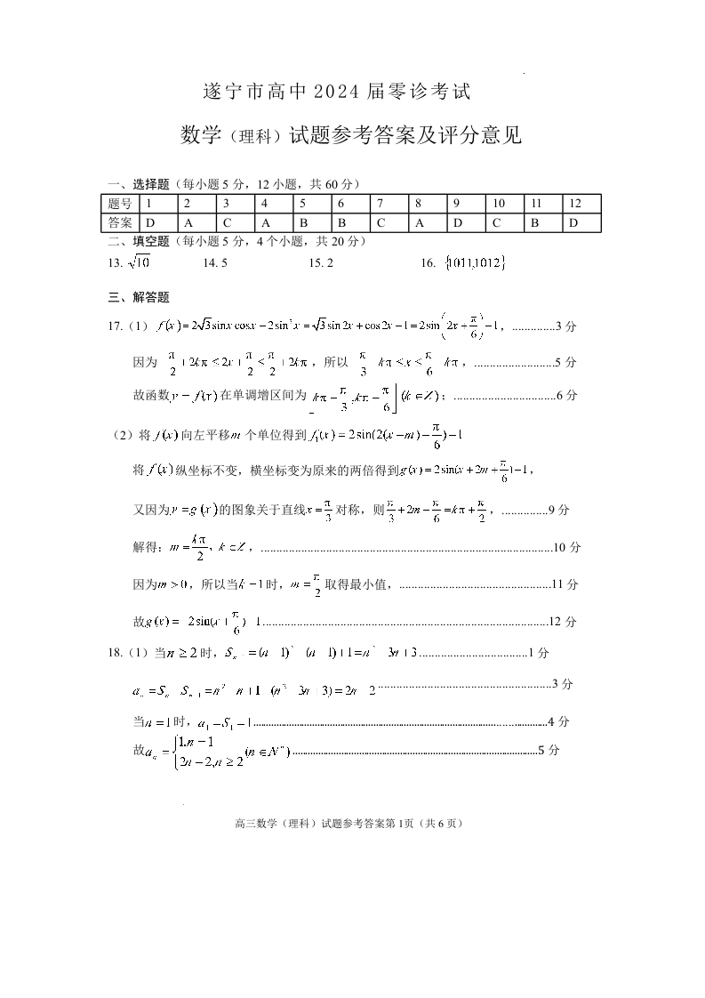 四川省遂宁市2024届高三上学期零诊考试理科数学答案