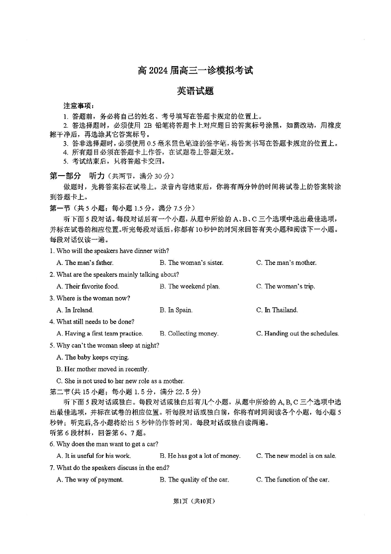 四川省成都市第七中学2024届高三上学期一诊模拟考试英语