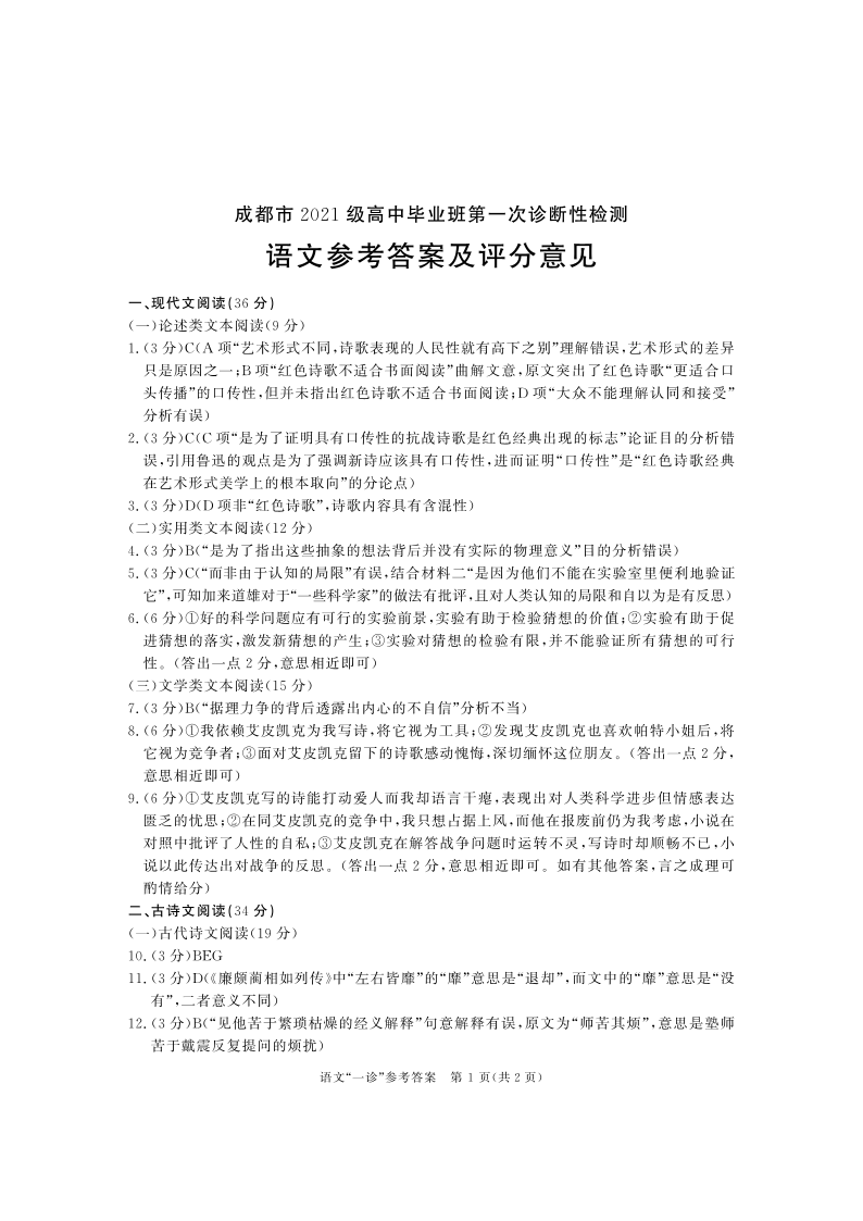 四川省成都市2021级高中毕业班第一次诊断性检测语文答案