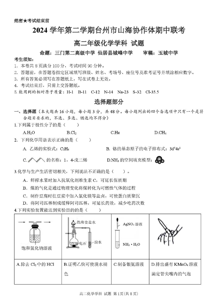 浙江省台州市山海协作体2024-2025学年下学期4月高二期中联考化学