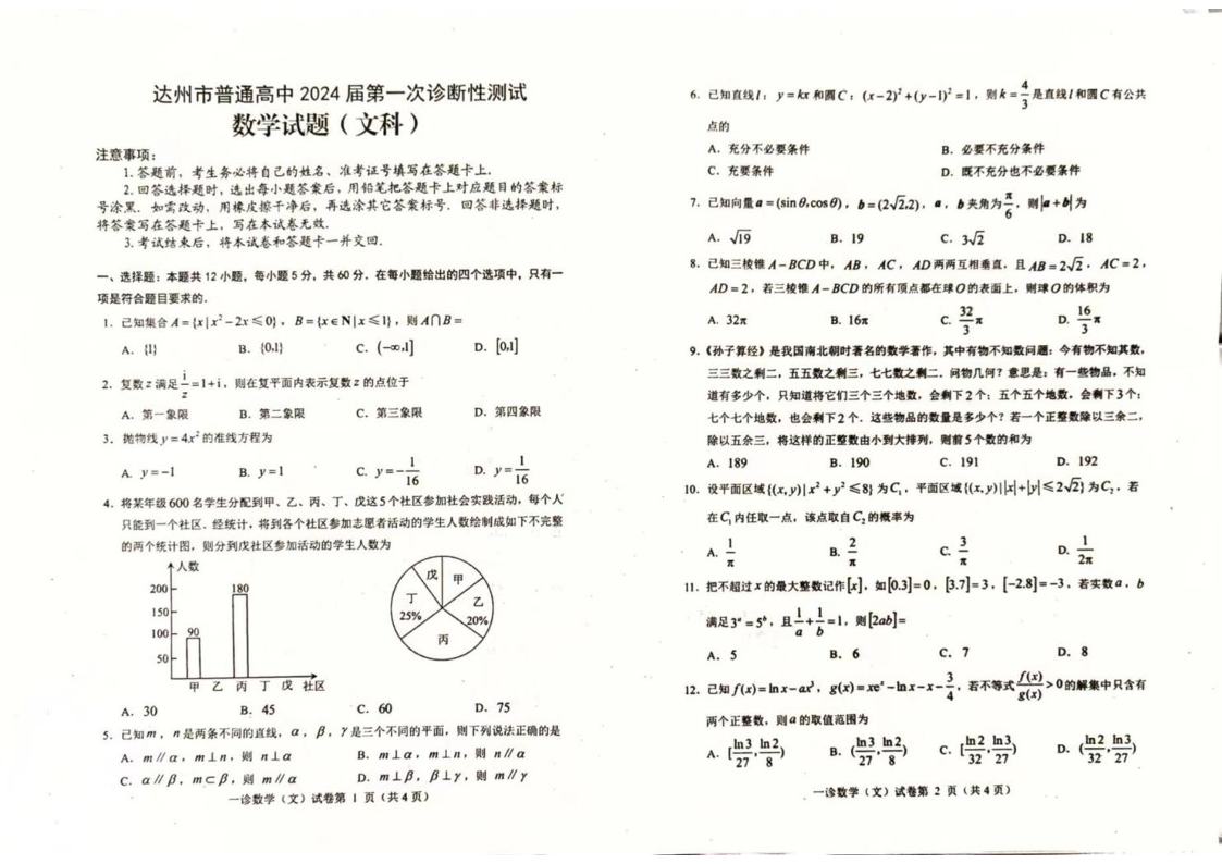 四川省达州市普通高中2024届高三上学期第一次诊断性考试文科数学