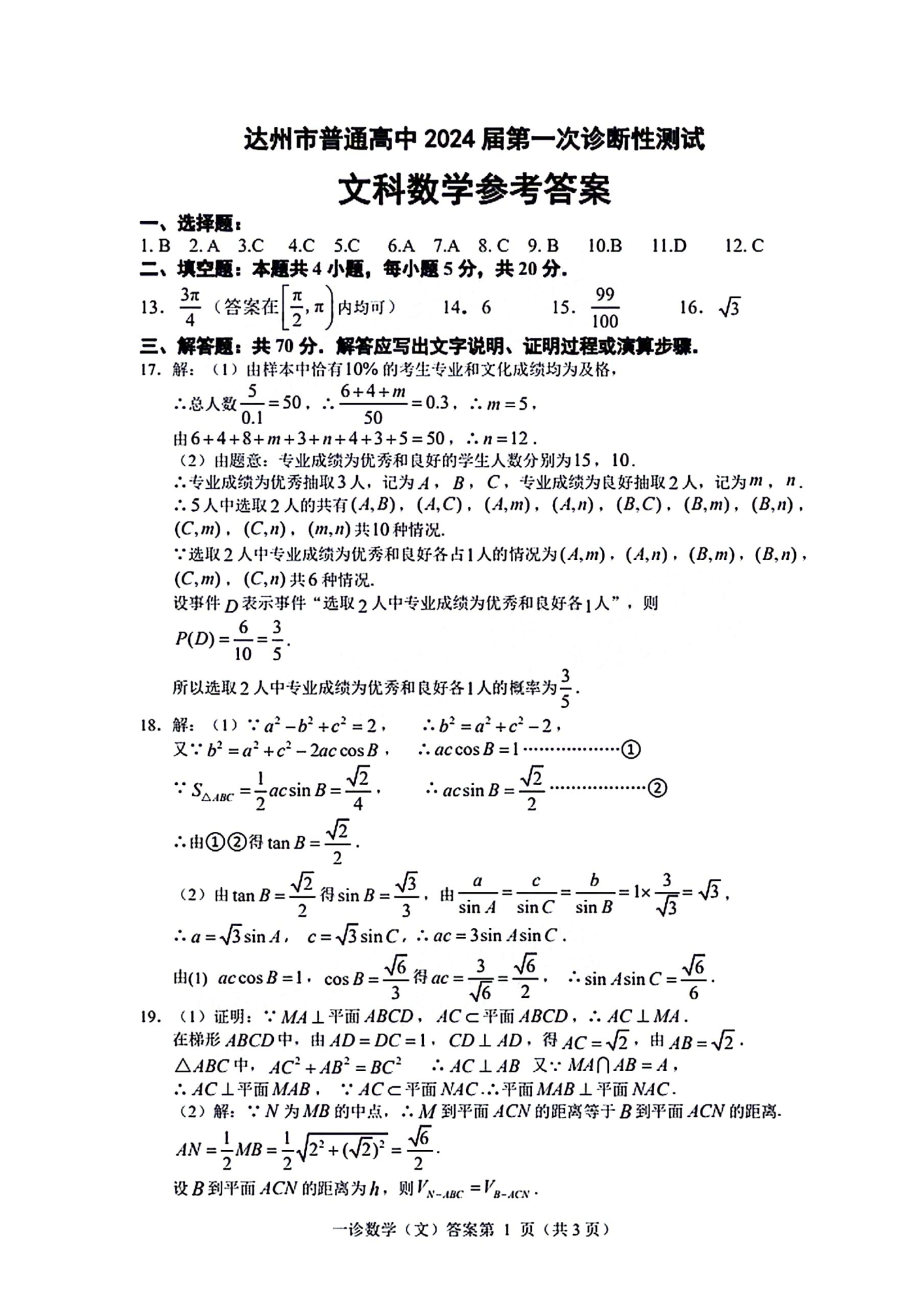 四川省达州市普通高中2024届高三上学期第一次诊断性考试文科数学答案