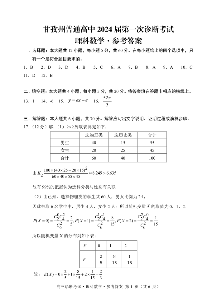 四川省甘孜州2024届高三上学期第一次诊断考试理科数学答案